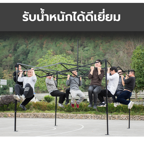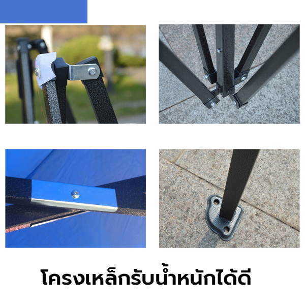- เต็นท์พับได้ โครงทำจากเหล็กพ่นกันสนิมแข็งแรงทนทาน (พ่นสีขาวหรือสีดำขึ้นอยู่กับล็อต)