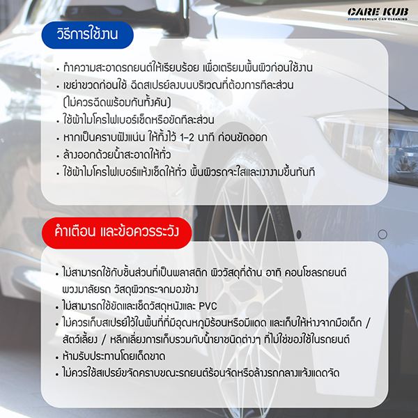- ไม่ควรใช้สเปรย์ขจัดคราบขณะรถยนต์ร้อนจัดหรือล้างรถกลางแจ้งแดดจัด