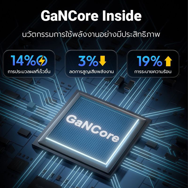 - GaNcore (Gallium Nitride) รุ่นล่าสุด แทนที่ซิลิคอนแบบเดิม ทำให้สามารถทำงานที่ความถี่สูง จ่ายไฟได้เสถียร